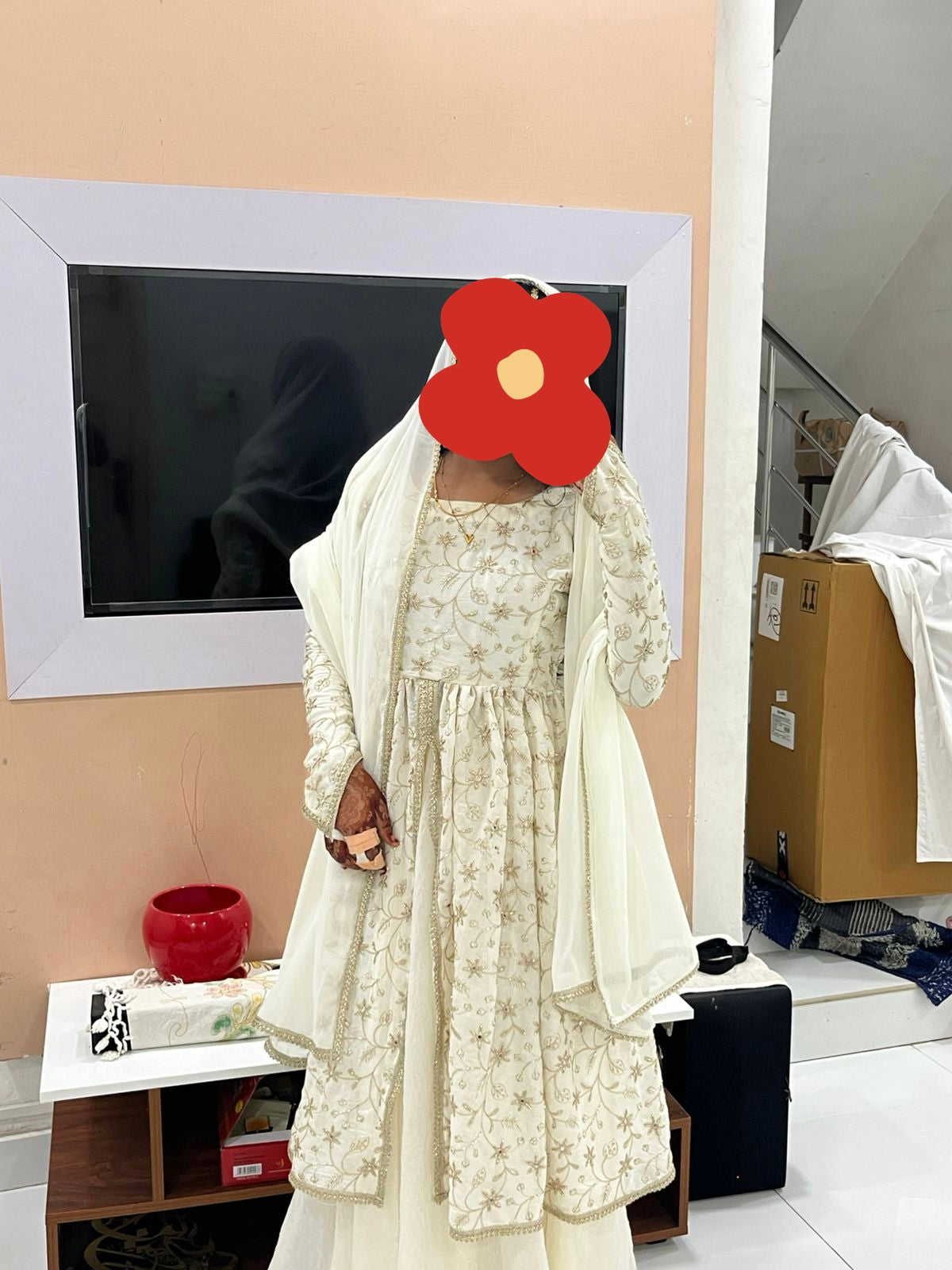 - Design: Long sleeves with scalloped lace borders and a matching embroidered Potli bag.